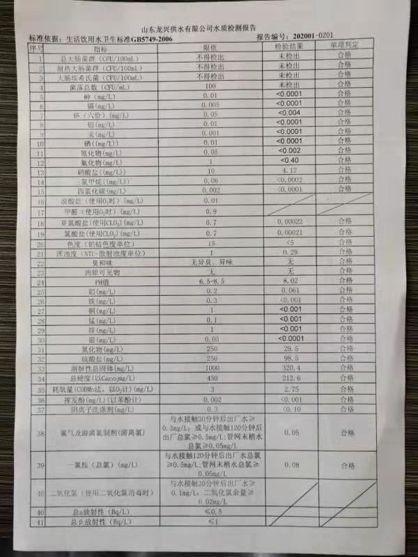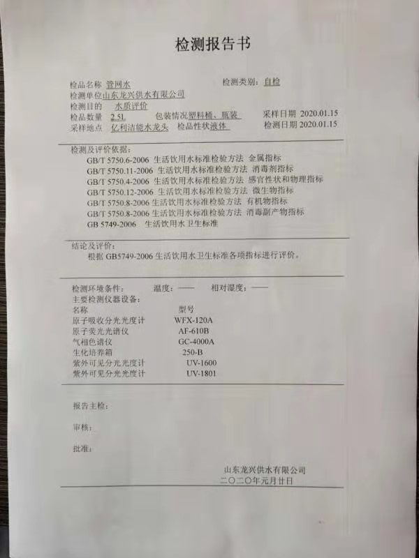 2020年1月億利潔能管網(wǎng)水龍頭水質(zhì)月檢報告